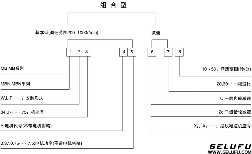 | 1、基本型:200-1000r/min 2、變速機(jī)帶一級(jí)齒輪減速(i=0.5-5):40-2000r/min 3、變速機(jī)帶二級(jí)齒輪減速(i=8-25) :8-125r/min |