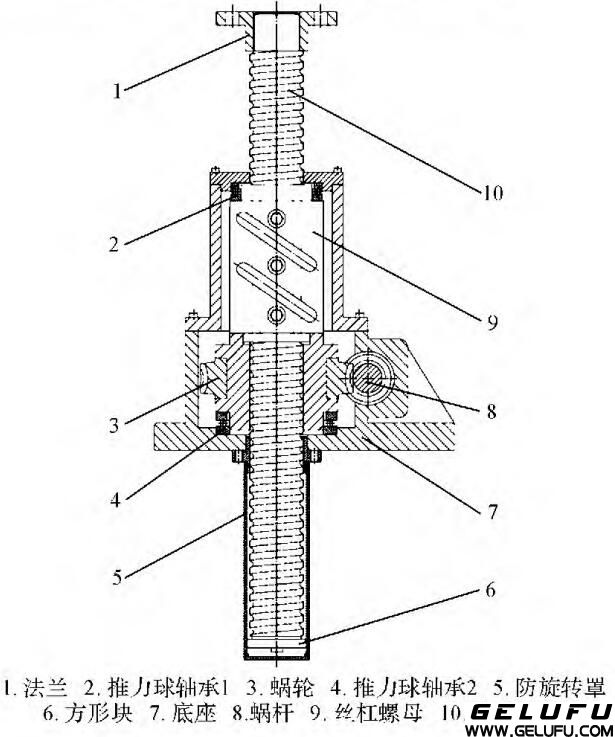 1.法蘭2.推力球軸承1 3.蝸輪4.推力球軸承2 5.防旋轉(zhuǎn)罩 6.方形塊7.底座8.蝸桿9.絲杠螺母10.滾珠絲杠