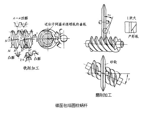 錐面包絡(luò)圓柱蝸桿螺旋面由錐面盤形銑刀或砂輪包絡(luò)而成,蝸桿軸線與刀具軸線在空間交叉成分度圓柱上的導(dǎo)程角。形成的齒廓在不同截面上成不同的曲線。齒廓形狀不但與蝸桿幾何參數(shù)有關(guān),而且與刀盤直徑有關(guān)。