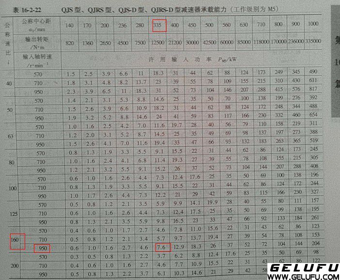當n=970r/min,i=160時,根據機械設計手冊對QJS型、QJRS型、QJS-D型、QJRS-D型承載能力表格,高速軸許用功率為7.6Kw,相對應的減速器為:QJRS-D 335-160 Ⅲ P