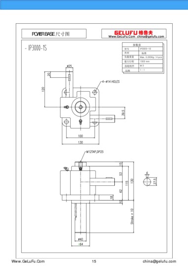 POWER BASE 尺寸圖 參數(shù)表 型號 IP3000-1S 類型 標(biāo)準(zhǔn) 負(fù)載重量 Max. 3,000Kg / 4 pcs 最大行程 1500 mm 齒輪組件 M 3 比例 1 : 1 eghtebas.com 15 china@gelufu.com