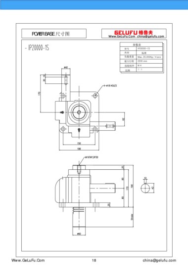 POWER BASE 尺寸圖 參數(shù)表 型號 IP20000-1S 類型 標(biāo)準(zhǔn) 負(fù)載重量 Max. 20,000Kg / 4 pcs 最大行程 2200 mm 齒輪組件 M 4 比例 1 : 1 eghtebas.com 18 china@gelufu.com