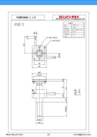 POWER BASE 尺寸圖 參數(shù)表 型號 IP500F-1S 類型 標(biāo)準(zhǔn) 負載重量 Max. 500Kg / 4 pcs 最大行程 600 mm 齒輪組件 M 1.5 比例 1 : 1 eghtebas.com 20 china@gelufu.com