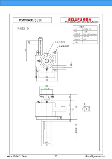 POWER BASE 尺寸圖 參數(shù)表 型號(hào) IP3000F-1S 類型 標(biāo)準(zhǔn) 負(fù)載重量 Max. 3,000Kg / 4 pcs 最大行程 1500 mm 齒輪組件 M 3 比例 1 : 1 eghtebas.com 23 china@gelufu.com