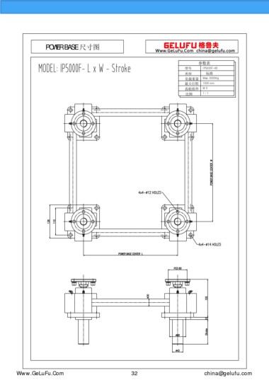 POWER BASE 尺寸圖 參數(shù)表 型號(hào) IP5000F-4S 類型 標(biāo)準(zhǔn) 負(fù)載重量 Max. 5000Kg 最大行程 1500 mm 齒輪組件 M 3 比例 1 : 1 eghtebas.com 32 china@gelufu.com