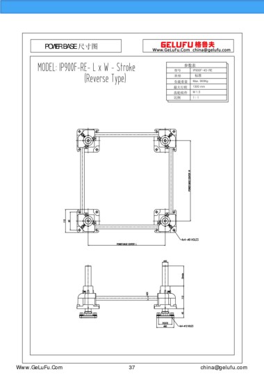 POWER BASE 尺寸圖 參數(shù)表 型號(hào) IP900F-4S-RE 類型 標(biāo)準(zhǔn) 負(fù)載重量 Max. 900Kg 最大行程 1300 mm 齒輪組件 M 1.5 比例 1 : 1 eghtebas.com 37 china@gelufu.com