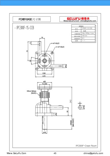 POWER BASE 尺寸圖 參數(shù)表 IP300F-1S-CCB 型號 類型 標(biāo)準(zhǔn) Max. 300Kg / 4 pcs 負(fù)載重量 最大行程 350 mm 齒輪組件 M 1 比例 1 : 1 IPC300F-Crean Room eghtebas.com 45 china@gelufu.com