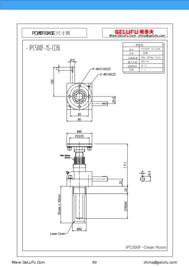 POWER BASE 尺寸圖 參數(shù)表 型號 IPC500F-1S-CCBL 類型 標(biāo)準(zhǔn) 負(fù)載重量 Max. 500Kg / 4 pcs 最大行程 600 mm 齒輪組件 M 1.5 比例 1 : 1 IPC500F-Crean Room eghtebas.com 50 china@gelufu.com
