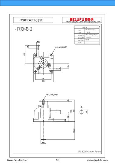 POWER BASE 尺寸圖 參數(shù)表 IPC900-1S-CC 型號 類型 標(biāo)準(zhǔn) 負(fù)載重量 Max. 900Kg / 4 pcs 最大行程 1300 mm 齒輪組件 M 1.5 比例 1 : 1 IPC900F-Crean Room eghtebas.com 51 china@gelufu.com