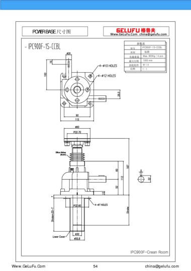POWER BASE 尺寸圖 參數(shù)表 IPC900F-1S-CCBL 型號 類型 標(biāo)準(zhǔn) 負(fù)載重量 Max. 900Kg / 4 pcs 最大行程 1300 mm 齒輪組件 M 1.5 1 比例 : 1 IPC900F-Crean Room eghtebas.com 54 china@gelufu.com