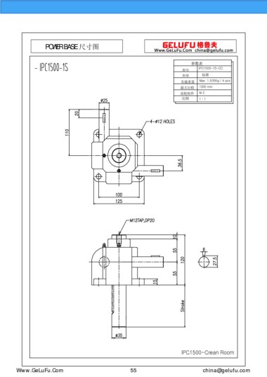 POWER BASE 尺寸圖 參數(shù)表 IPC1500-1S-CC 型號 類型 標準 負載重量 Max. 1,500Kg / 4 pcs 最大行程 1300 mm 齒輪組件 M 2 比例 1 : 1 IPC1500-Crean Room eghtebas.com 55 china@gelufu.com