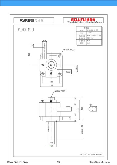 POWER BASE 尺寸圖 參數(shù)表 型號(hào) IPC3000-1S-CC 類型 標(biāo)準(zhǔn) 負(fù)載重量 Max. 3,000Kg / 4 pcs 最大行程 1500 mm 齒輪組件 M 3 比例 1 : 1 IPC3000-Crean Room eghtebas.com 59 china@gelufu.com