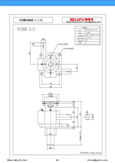 POWER BASE 尺寸圖 參數(shù)表 型號 IPC5000F-1S-CC 類型 標(biāo)準(zhǔn) Max. 5,000Kg / 4 pcs 負(fù)載重量 最大行程 1500 mm 齒輪組件 M 3 比例 1 : 1 IPC5000F-Crean Room eghtebas.com 63 china@gelufu.com