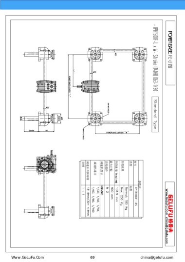 POWER BASE 尺寸圖 標(biāo)準(zhǔn) NMRV063 eghtebas.com 比例 減速后升降舉例 69 減速機(jī)速比 減速機(jī)型號(hào) 齒輪組件 最大行程 升降速度(1rev/mm) 負(fù)載重量 類(lèi)型 型號(hào) 參數(shù)表 china@gelufu.com