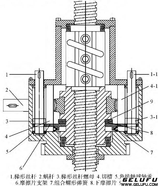滾珠絲桿升降機(jī)制動(dòng)結(jié)構(gòu)簡(jiǎn)圏如圖2所示。 整個(gè)制動(dòng)結(jié)構(gòu)主要有梯形絲桿、禪形絲桿螺母、 摩檫片支架、角接觸球軸承、組合蝶形彈簧及摩 擦片等組成。其工作原理為減速電機(jī)帶動(dòng)梯形絲 桿1、1-1做旋轉(zhuǎn)運(yùn)動(dòng),梯形絲桿帶動(dòng)梯形鏠桿 螺母3、34做JTF移動(dòng),梯形絲桿螺母和摩擦 片支架6之間用.銷(xiāo)軸連接,當(dāng)螺母3、3-1向下 運(yùn)動(dòng)時(shí),它們向下推摩擦片支架,組合碟形彈簧 7被班縮,摩擦片8和9分開(kāi),制動(dòng)松閘;當(dāng)螺 母3、3-1向上運(yùn)動(dòng)時(shí),它們和摩擦片支架分開(kāi), 摩擦片支架在組合碟形彈簧的作用下向上運(yùn)動(dòng),摩擦片8和9接觸壓紫,蝸輪和絲杠螺母被制 動(dòng),即絲杠螺母不能逆旋轉(zhuǎn),從而滾珠絲杠不能 上下移動(dòng),實(shí)現(xiàn)滾珠絲桿升降機(jī)制動(dòng)。