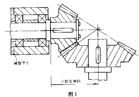 首先,根據制造者提供的安裝距將小輪定位(圖1)。為此應裝上未配磨好的調整墊片,測量出安裝距,計算出調整墊片的正確尺寸。測量安裝距也可用專門的量具測量。然后再按標明的側隙調整大輪,這一側隙應在嚙合的 緊點測量,可用壓表法測。先把小輪固定,防止轉動,牢固裝上百分表,使百分表觸頭垂直于輪齒大端 外接近節(jié)圓直徑的齒面,正反向轉動大輪