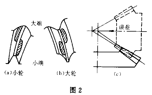 *小頂大根式 即輪齒接觸區(qū)位于小輪齒面的齒頂和大輪齒面的齒根,這是由小輪安裝距不正確引起的,應沿軸問移出小輪,為保證側隙和接觸區(qū)也可能需要沿軸向移入大輪(圖2)。這種情況大輪凸面的接觸區(qū)靠近小端,凹面接觸區(qū)應靠近大端,而小輪接觸區(qū)與大輪的正好相反。