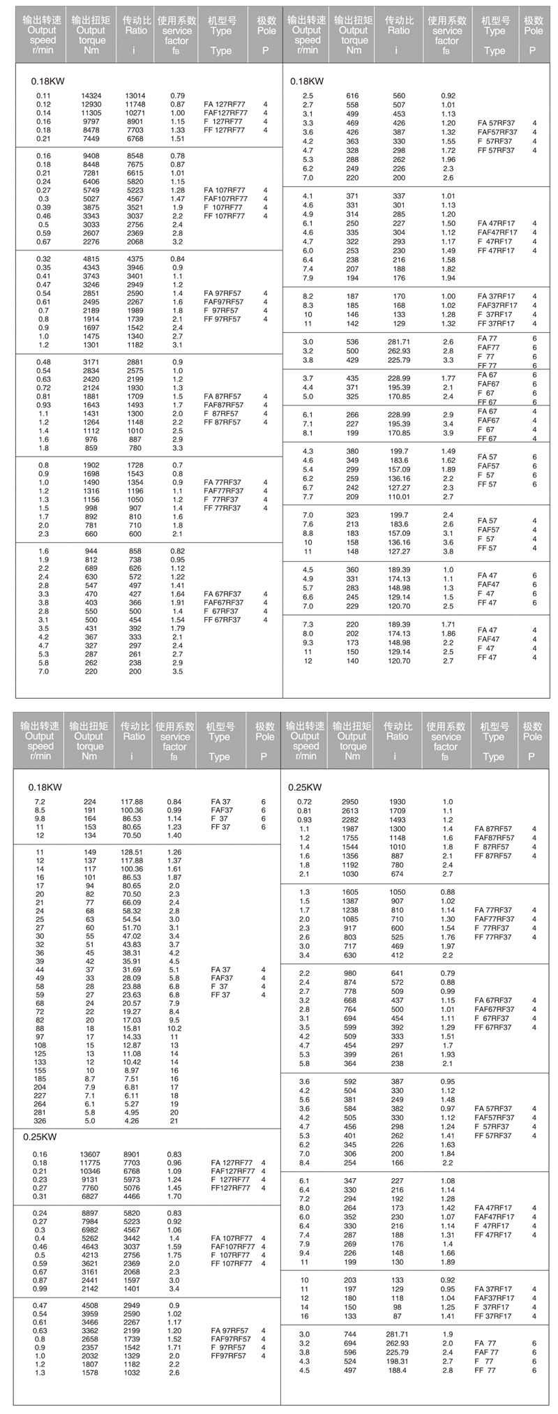 F系列平行軸斜齒輪減速機(jī)功率表及安裝尺寸圖