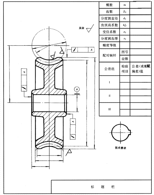 蝸桿、蝸輪圖樣的繪制應(yīng)符合GB4459.2的規(guī)定。圖樣中的參數(shù)表一般放置于圖面的右上方,參數(shù)表中列出的數(shù)據(jù)項(xiàng)目可根據(jù)需要增減,檢驗(yàn)項(xiàng)目則按使用要求和用戶意見(jiàn)根據(jù)GB10089和有關(guān)標(biāo)準(zhǔn)的規(guī)定確定。圖樣的技術(shù)要求一般放置于圖面的右下方。