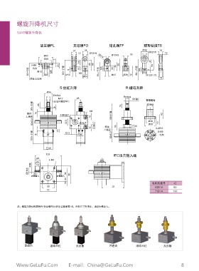 注:螺旋升降機(jī)配置附件:安全螺母SN和反齒隙裝置AB,外形尺寸有變化,請(qǐng)咨詢格魯夫。