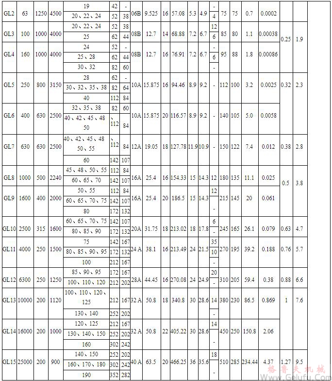 注:1.有罩殼時(shí),在型號(hào)后加“F”,例 GL5 型聯(lián)軸器,有罩殼時(shí)改為 GL5F。 2.表中聯(lián)軸器質(zhì)量、轉(zhuǎn)動(dòng)慣量是近似值。